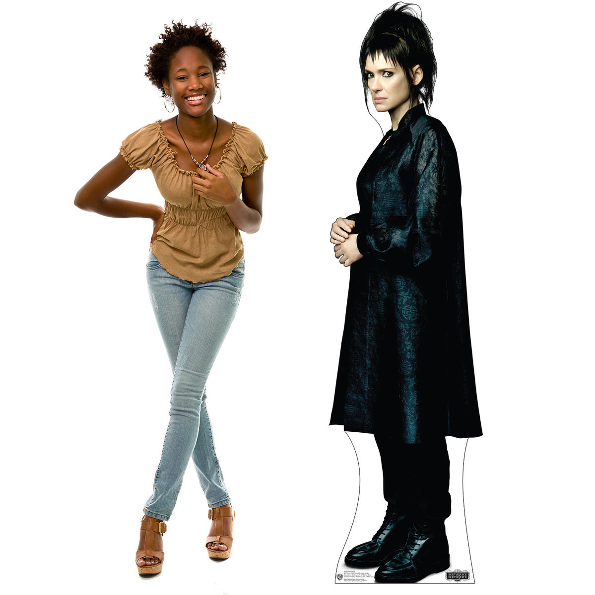 This is a cardboard cutout of Lydia Deetz from the new movie Beetlejuice Beetlejuice. Easy to set up, it features a single-sided, high-quality print on cardboard with an easel on the back so that it can stand on its own. Cardboard stand-ups make great decor for parties, photo ops, and events.