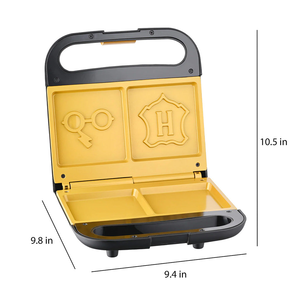 The Warner Brothers Harry Potter Sandwich Maker unlocks a magical experience by imprinting a Hogwarts crest or Harry's glasses right onto your sandwich. This sandwich maker lets any kitchen wizard show off their Hogwarts pride and create a mouth-watering grilled cheese or delicious sandwich in just a few minutes. The sandwich machine grills two sandwiches at the same time, one with the Hogwarts crest and the other with Harry's glasses. The ceramic coating is durable, easy to clean and is free of both PFOA and PTFE. This magical touch of the Hogwarts crest and Harry's glasses is sure to make mealtimes more enjoyable for the biggest Harry Potter fans. It's the perfect way to combine food and fun together, making it a great addition to any kitchen.- Cook 2 sandwiches in just minutes with this panini press