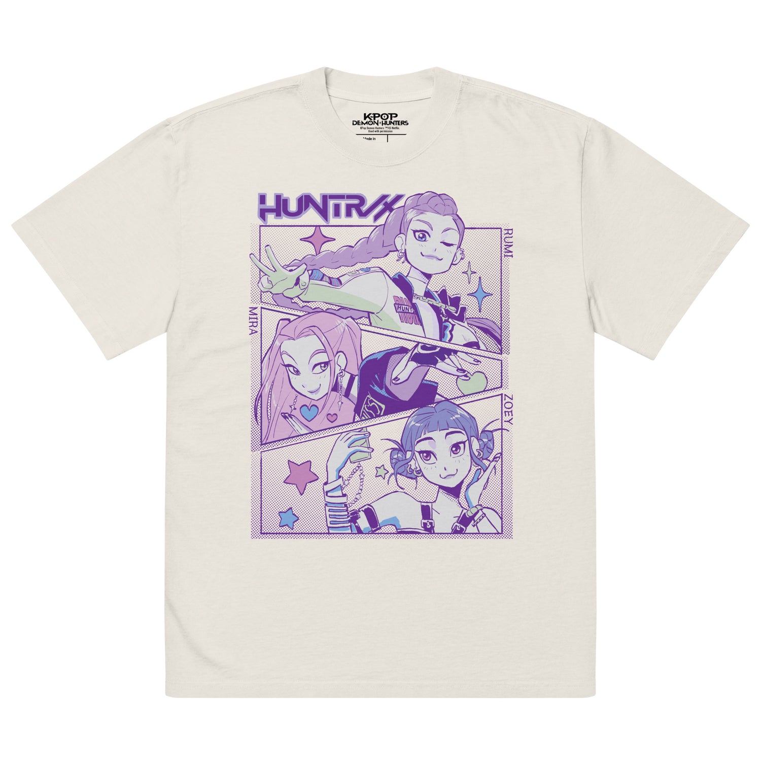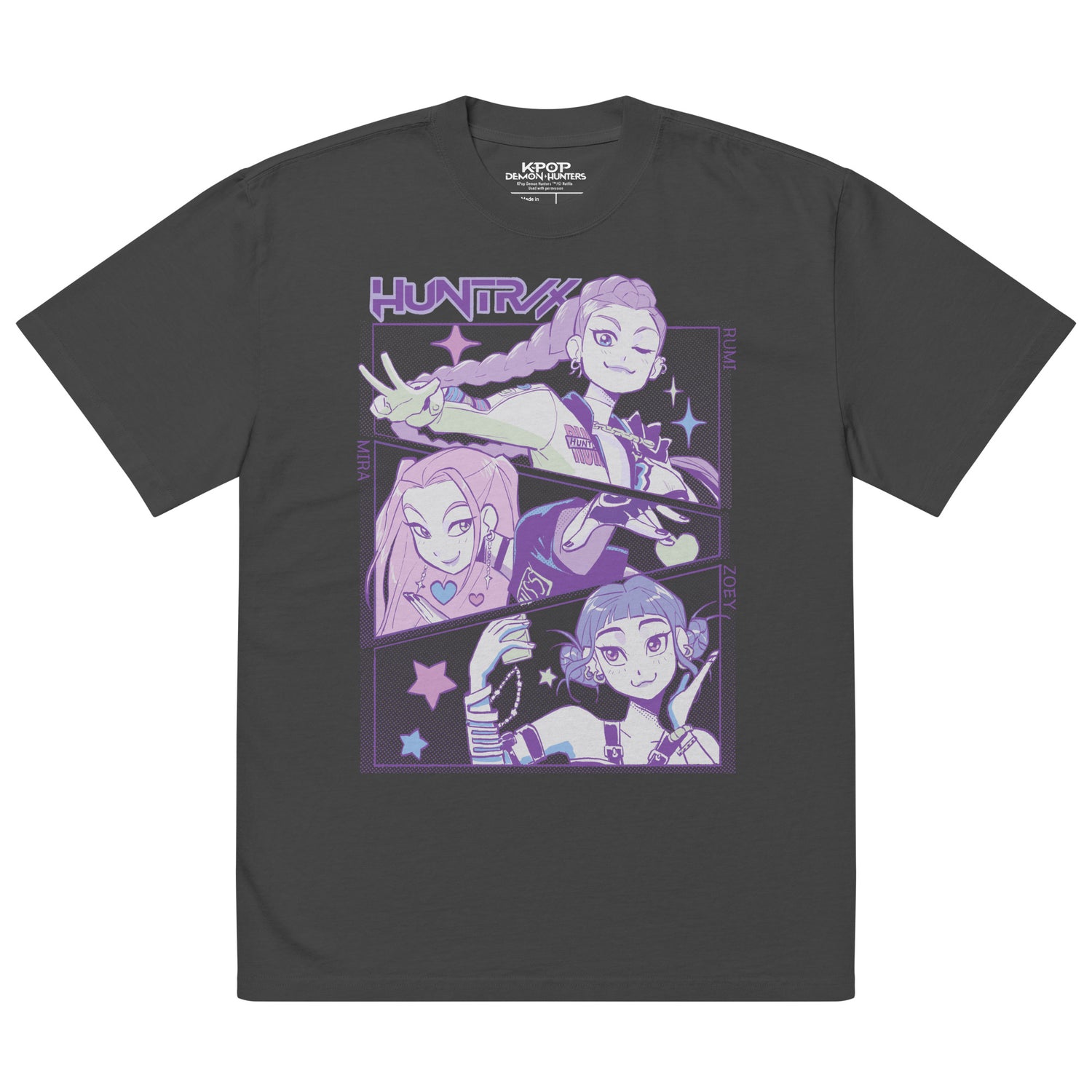 Gear up in the KPop Demon Hunters HUNTR/X Oversized Faded T-Shirt, featuring bold character art and a vintage wash. Perfect for fans seeking comfort, edgy streetwear style, and a powerful nod to the thrilling demon-hunting adventure.